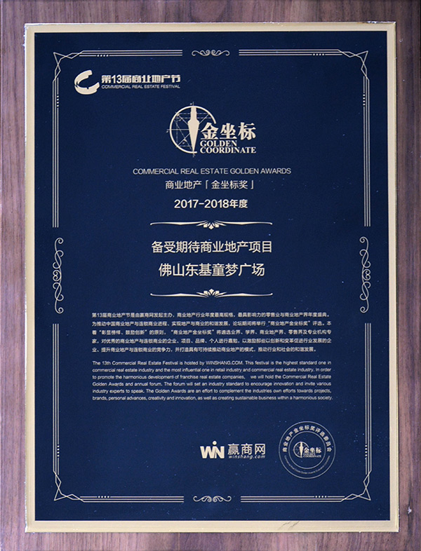 在中国商业地产【金坐标】颁奖盛典上,东基童梦广场其凭借其独特定位、清晰的发展战略及行业领先性,荣膺“2017-2018年度备受期待商业地产项目”大奖。