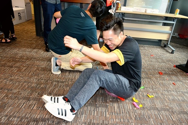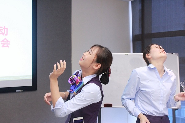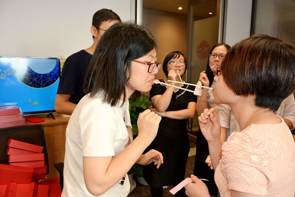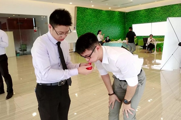 考验了最强大脑后,接下来上场的是合力吹气球、吸管传钥匙圈等游戏,主要考察团队的配合度、亲密度和准确性。“猛得坐下,气球更容易破”“注意头不要仰的太高”“加油”……各组队员在游戏中研究战略战术,互相鼓励,同心协力在规定时间内完成任务,不时还进行自我挑战。这些工作外难得的合作机会,提高了大家的默契度,也拉近了彼此的心。