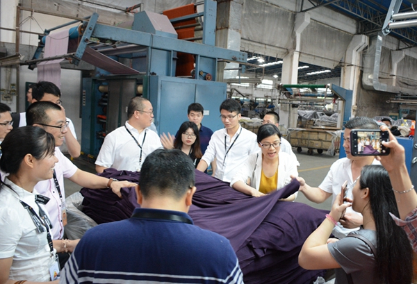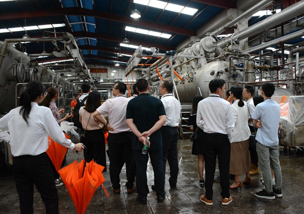 到东岳纺织时已是下午,虽然下着雨,但丝毫没有影响到大家的热情。东岳纺织以布匹染色为主,配备有世界先进的染色设备,员工最多时达1300多人。